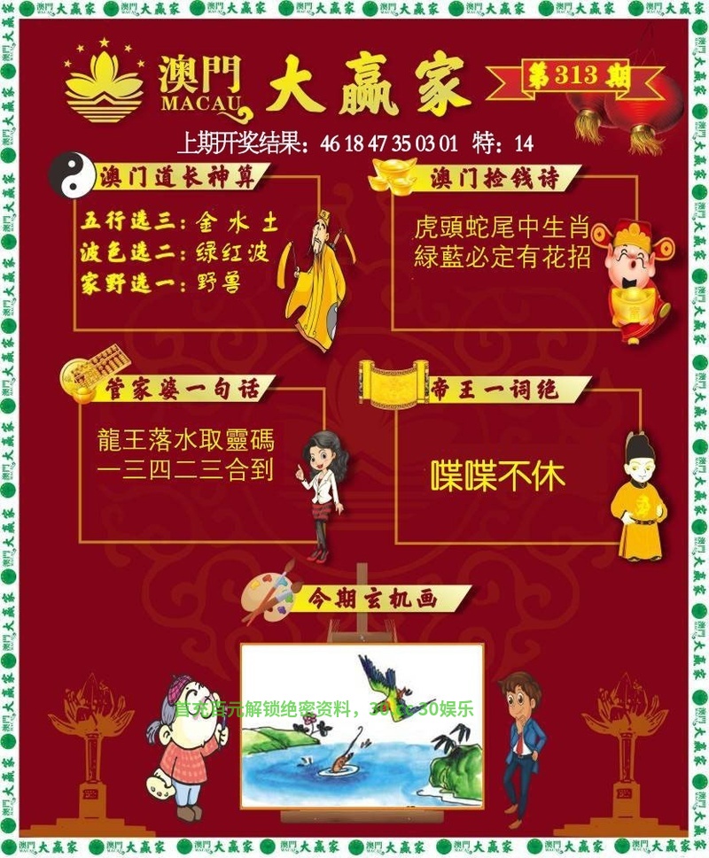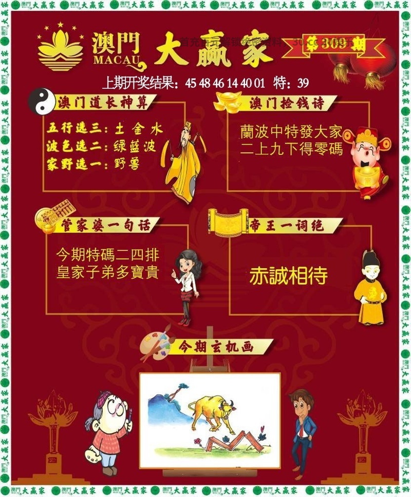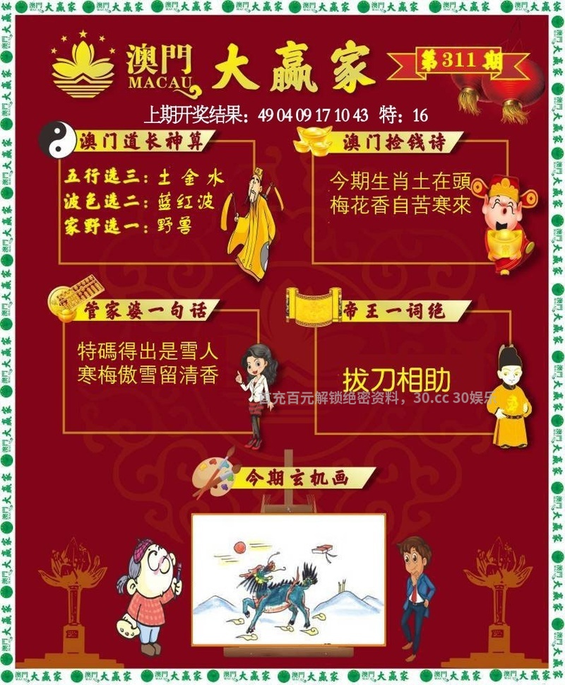 313期:今期生肖一六开,牛来本期看四九。画蛇添足反类犬,绿波有望出旺码。春色红梅香万树,时享运到获大财。四七相加二四合,向上三期博六合。 |